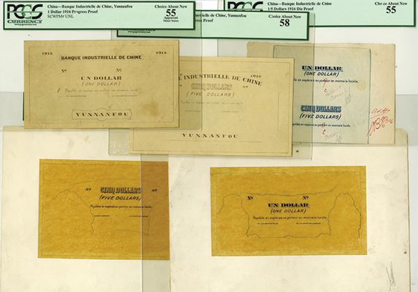 China. Lot of 5 Essay Proofs and mockup designs for $1 and $5 denomination notes. Included is an intaglio printed die proof in blue for the denominations for $1 and $5 notes in French text with 1916 approval signature; 2 different photo proofs of the face design with titles and denominations with place name "YUNNANFOU" on the bottom for the $1 and $5 notes; and two hand drawn notes with denomination and outline of where design would be in pencil, pen and ink printed on off white paper mounted on large thin card of the $1 and $5 denominations. All are PCGS graded between Choice AU 55 to uncirculated 62. Rare if not unique production material used in the design and development of this very rare foreign bank with unlisted location. (5).