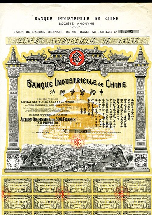 France, 1913, 500 Francs, Issued Bond, #192862, Black print with yellow underprint, Very ornate oriental structure with temple underprint and city at bottom, VF condition.