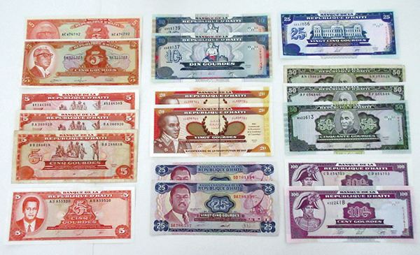 Group of assorted Haitian issues, includes 1 Gourde, 1989, P-253 (21 pcs, Gem Unc); as well 5 Gourdes, 10 Gourdes, 25 Gourdes, 50 Gourdes, and 100 Gourdes 1987-2000 issues (10 pcs), including Gem Unc P-258 and P-268; an assortment of 1970s-1980s issued 1-2-5 Gourdes (11 pcs, generally Unc); issued 25 Gourdes, L.1973, P-218 (2 pcs, 1 Choice VF, one Choice Unc); and 20 Gourdes, 2001, P-271A (2 pcs, Gem Unc). Good dealer lot, please inspect.