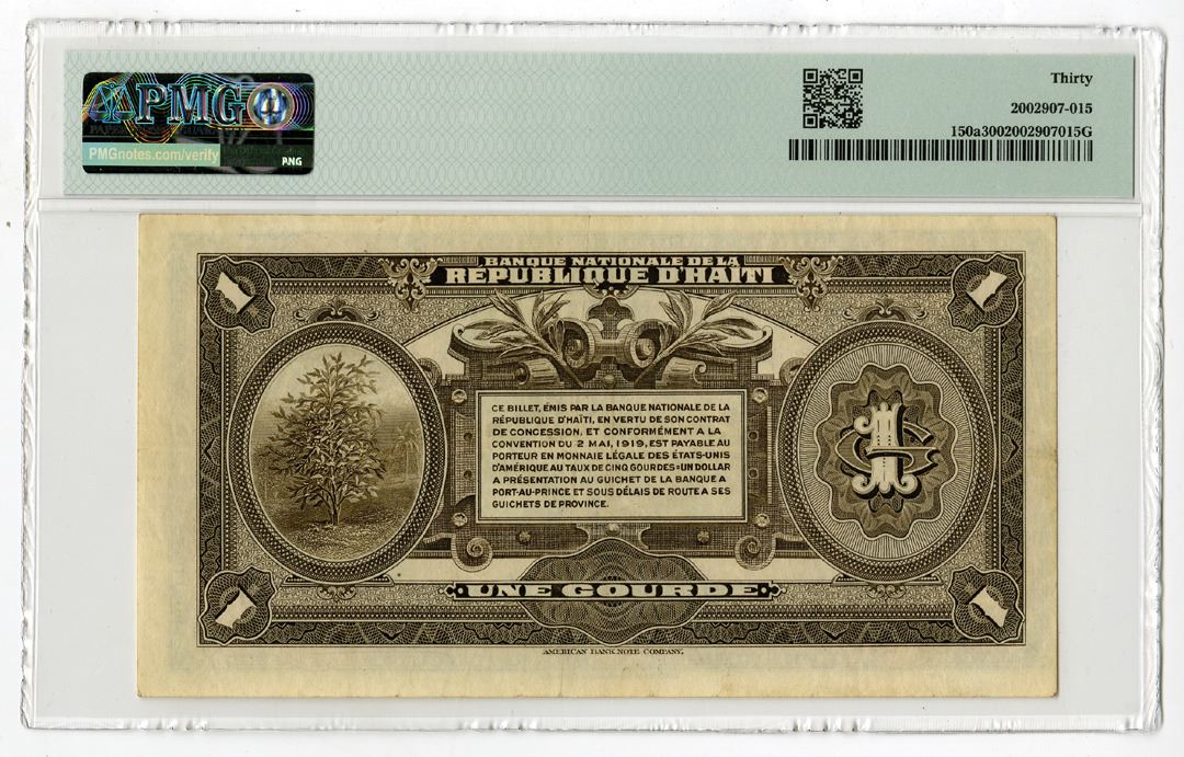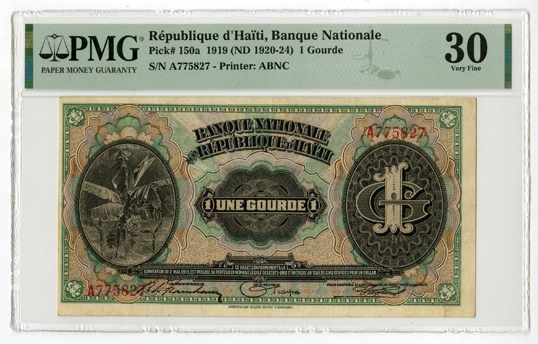 Haiti, 1919 (ND 1920-24). 1 Gourde, P-150a, Issued Banknote, Black on green and brown underprint, Banana plant at left, S/N A775827, PMG graded Very Fine 30, ABNC.