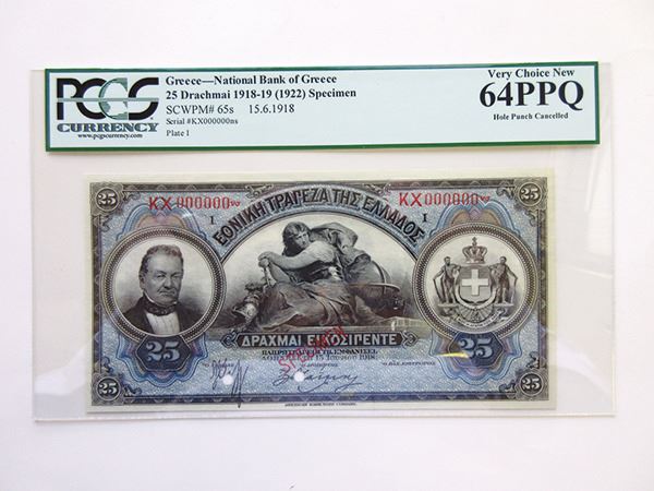 Greece, 25 Drachmai, P-65s, Specimen Banknote, Black blue and m/c underprint, Plate 1, S/N KX000000, PCGS graded Very Choice Uncirculated 64PPQ. ABNC.