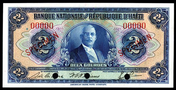 Banque Nationale De La Republique D'Haiti, 1935-42 Third Issue Specimen Pair. Haiti, ND (ca.1935-42), Lot of 2 Specimen banknotes, Both are third Issue (ca.1935-42). Includes 1 Gourde, P-167s, PMG graded Superb Gem Uncirculated 67 EPQ; 2 Gourdes, P-168s, PMG graded Gem Uncirculated 66 EPQ, both with "Specimen" overprints, "00000" serial numbers and POC's. ABNC. Scarce pair of notes. Tied with finest known and highest grade in the PMG census.