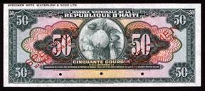 ND Fifth Issue, (ca.1950). 50 Gourdes, P-176s Unlisted Color Trial Specimen with green face and red back instead of issued olive face. Red Specimen overprints and POC's. Top left margin has "Specimen Note, Waterlow and Sons, Ltd.". Rare note only known as specimen and even rarer as color trial specimen. W&S.