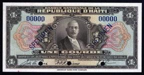 Lot of 2 Specimen banknotes from the Convention Du 12 Avril 1919 - Third Issue (ca.1935-42). 1 and 2 Gourdes. P-178s and P-179s. Red or blue specimen overprints, "00000" serial numbers and POC's. President Vincent in middle. Unc. to CU. ABNC. Rare notes in any condition.