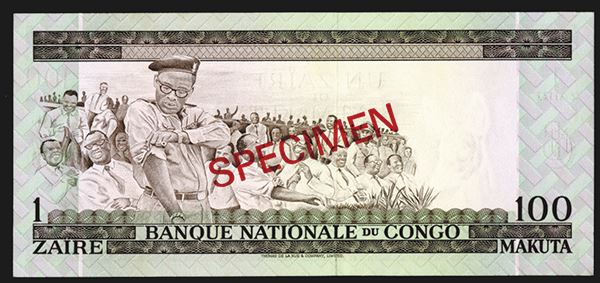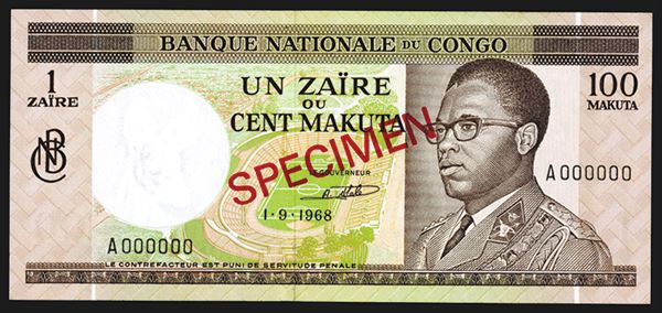 Congo, 1-9-1968, 1 Zaires = 100 Makuta, P-12s2, Specimen banknote, Brown and Green on m/c with Mobutu at right, back with Mobutu, Specimen overprints and "000000" serial numbers. Choice AU to Uncirculated condition. TDLR. Scarce note.