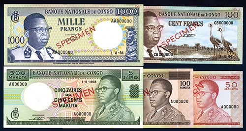 Congo, Lot of 5 notes, All are dated between 1964 and 1970, Includes 100 Francs and 1000 Francs, P6s and P-8s; and, 1 Zaire, 50 Makuta and 5 Zaires Specimens, P-11s; 12s and 13s, all are in Uncirculated to CU condition, All with red Specimen overprints and S/N 000000”, Attractive assortment of Congo Specimen banknotes, TDLR.