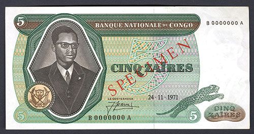 Congo, 24-11-1971, 5 Zaires, P-14, Specimen banknote, specimen overprints, S/N B 0000000 A, Uncirculated to CU condition, G&D.