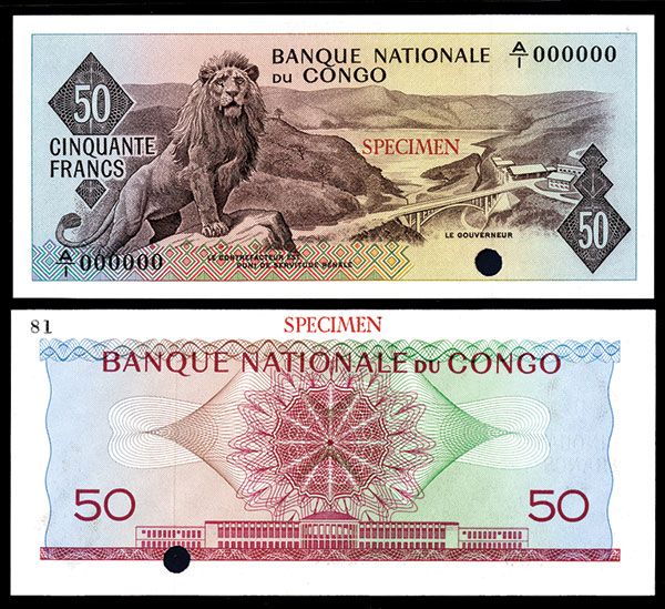 Congo Democratic Republic, 50 Francs, P-5cts Specimen Color Trial banknote, Blue and brown on m/c with lion at left, Specimen overprints and S/N A/1 000000, PMG graded Superb Gem Uncirculated 67 EPQ, This is the highest graded example in the PMG census.