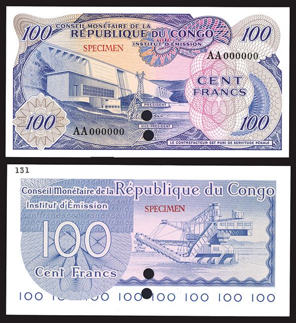 Congo Democratic Republic, 100 Francs, P-1cts Specimen Color Trial banknote, Blue and m/c, Specimen overprints and S/N AA 000000, PMG graded Superb Gem Uncirculated 68 EPQ, This is the highest graded example in the PMG census and it is virtually perfect and no doubt will be impossible to improve upon.