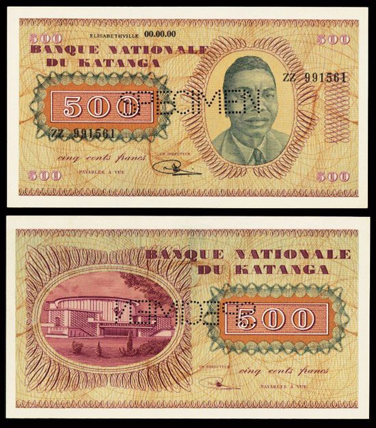 Elisabethville, Katanga, 1960, 500 Francs, P-9s, Signature #1, S/N ZZ 991561 - 00.00.00, Olive green portrait on chestnut brown underprint, portrait of Tshombe on right, back with building at left, Pin punch SPECIMEN, PMG graded Gem Uncirculated 66 EPQ (Exceptional Paper quality), rarely seen second highest value of this series in a condition that will be difficult if not impossible to improve upon.