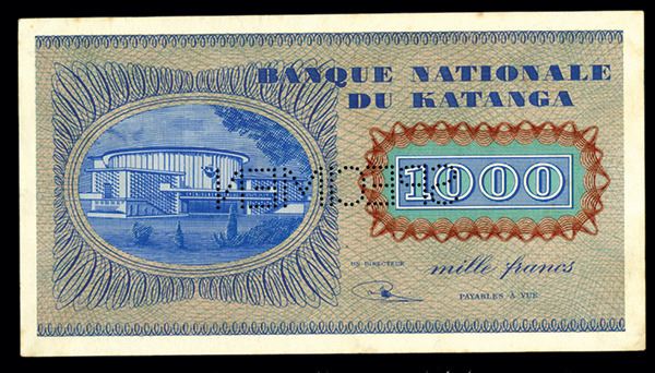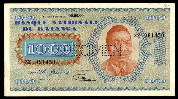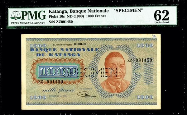 Elisabethville, Katanga, 1960, 1000 Francs, P-10s, Signature #1, S/N ZZ 991450 - 00.00.00, Light blue on chestnut brown portrait and underprint, portrait of Tshombe on right, back with building at left, Pin punch SPECIMEN, PMG graded Uncirculated 62. Attractive high denomination note.