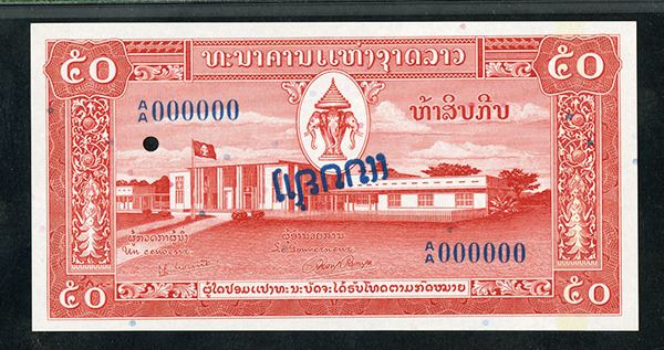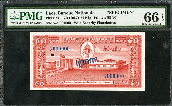 Laos, 50 Kip, P-5s1. Specimen. Red with blue Specimen overprint, back orange with elephant, PMG graded Gem Uncirculated 66 EPQ. Rarely seen this nice. SBNC. Tied with one other note as finest graded out of 7 in the PMG census.