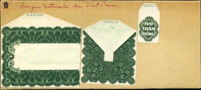 Viet Nam-South. Banque Nationale Du Viet-Nam. ND (1955). P-8; P-9. 100; 200 Doug 9 Proofs of borders, numerals, text and corners printed in green on india paper and mounted on manila envelopes. Used in some format on P-8, 100 Dong and P-9, 200 Dong banknotes. Rare archival production material. ABNC.