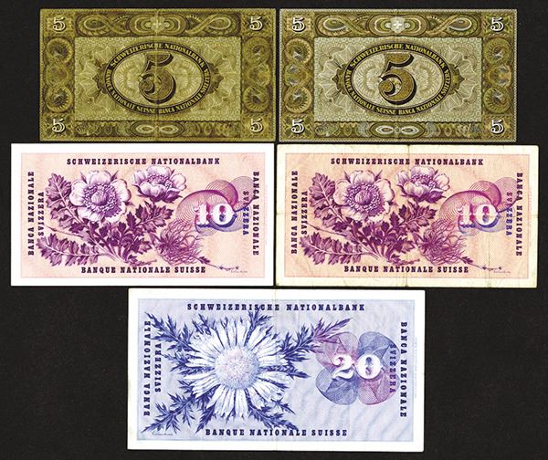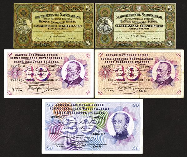 Switzerland. 5, 10, 20 Francs. P-11j; 11o; 45c; 45j; 46l. Fine to Choice Very Fine. 5 pieces.