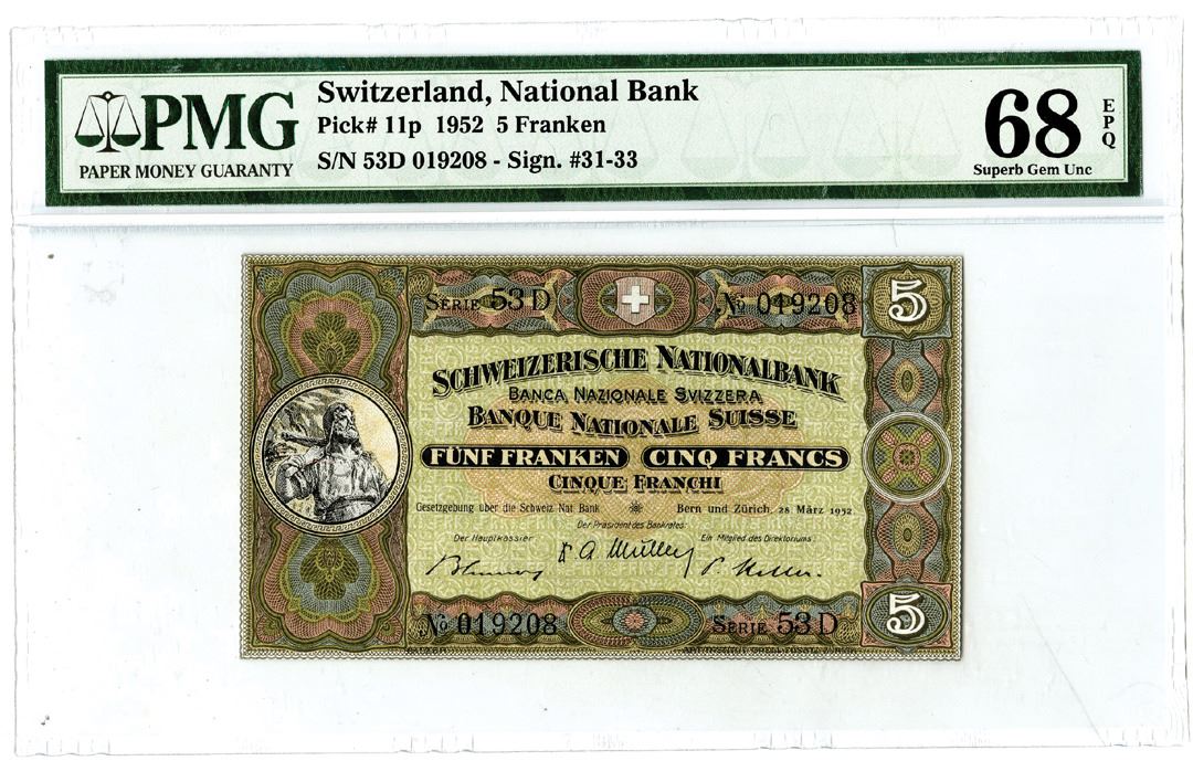 Switzerland. 1952. 5 Franken, P-11p, Issued banknote, Red and blue on olive green underprint, S/N 53D 019208, Sign. #31-33, PMG graded Superb Gem Uncirculated 68 EPQ.