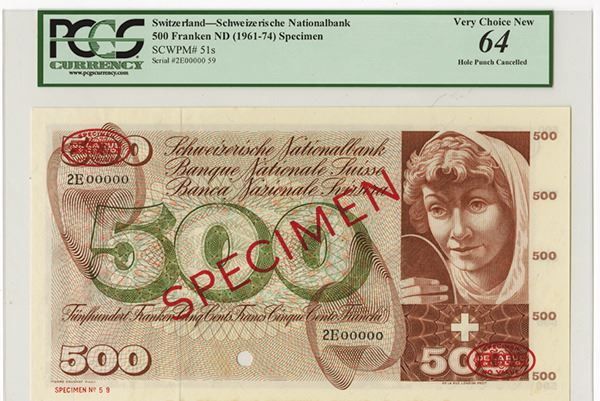 Switzerland. ND, 500 Francs, P-51s, Specimen and Oval TDLR overprints on top left and lower right corners, Minor Mounting remnants on back right margin that is difficult to view. S/N 2E 00000 59, PCGS graded Very Choice New 64, POC, TDLR.