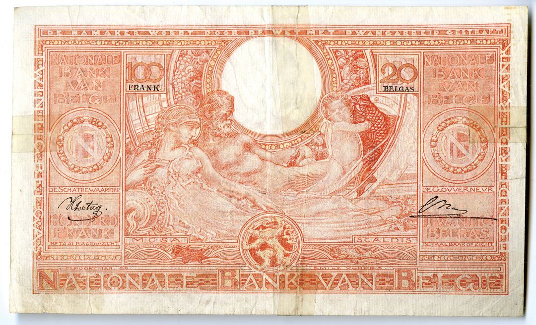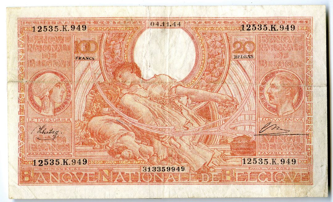 Belgium. 1944. 100 Francs - 20 Belgas, P-113, Issued banknote, Orange, S/N 12535.K.949. Fine condition with horizontal crease.
