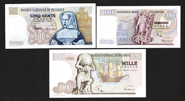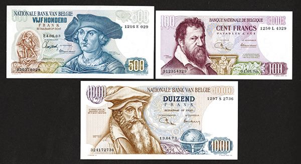 Belgium. 100, 500, 1000 Francs. P-134b, 135a, 136b. Nice portraits of Lombard, van Orley and Mercator. First and last are Very Choice Uncirculated, the 135 is FE with a slight margin fold. 3 pieces. (Arthur C. Matz Collection)