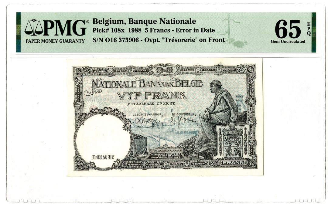 Belgium. 1988. 5 Francs, P-108x, Error in Date, Issued Banknote, Light blue, S/N O16 373906 - Ovpt. "Tresorerie" on Front, PMG graded Gem Uncirculated 65 EPQ. Only 3 graded in the PMG census, this is the highest graded example.