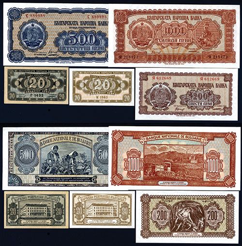 Lot of 5 different notes, Bulgaria, all dated 1948 to 1950, Includes 20; 200; 500 and 1000 Leva, P-74a; 75a; 77a and 78a (not issued) and also includes 1950, 20 Leva, P-79, all are Uncirculated to CU condition, Attractive Bulgaria assortment.