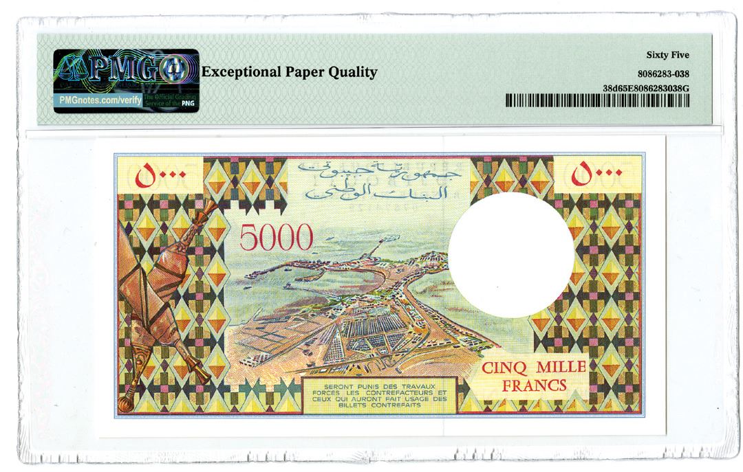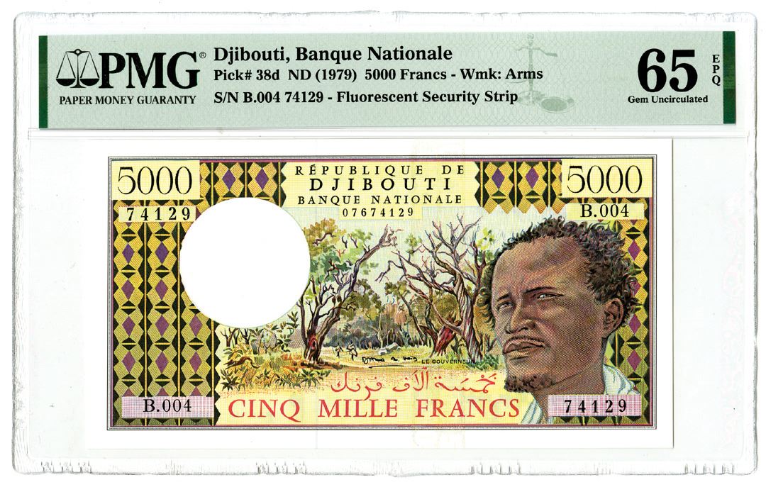 Djibouti. ND (1979). 5000 Francs, P-38d, Issued banknote, Multicolor with man at right, S/N B.004 74129 - Fluorescent Security Strip, Watermark: Arms, PMG graded Gem Uncirculated 65 EPQ.