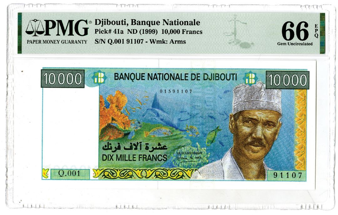 Djibouti. ND (1999). 10,000 Francs, P-41a, Issued banknote, Blue and multicolor, S/N Q.001 91107, Watermark: Arms, PMG graded Gem Uncirculated 66 EPQ.