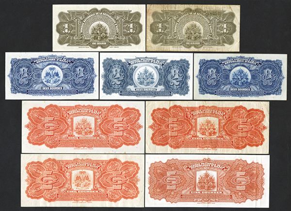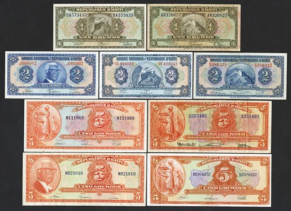 Haiti. 1, 2, 5 Gourdes. Citadel or coffee pickers on most. 1940's and 50's issues. Fine to CU. 9 pieces.