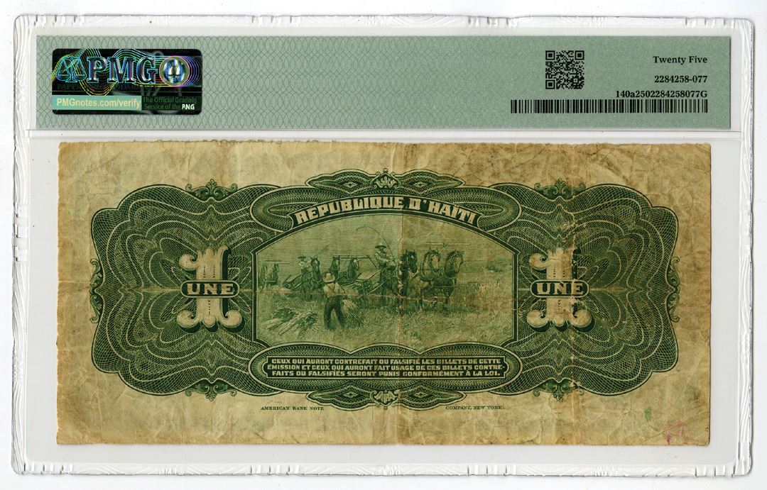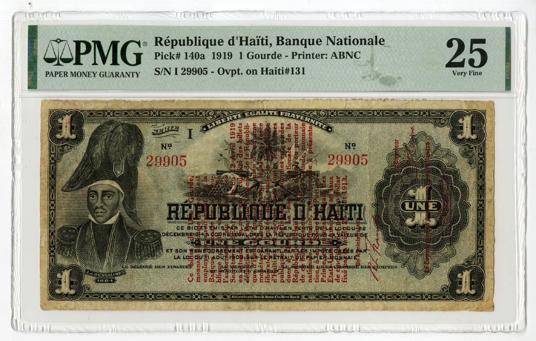 Haiti, 1919. 1 Gourde, P-140a, Issued banknote, Black on blue underprint with portrait of Dessalines at left, S/N I 29905 - Ovpt. On Haiti #131, PMG graded Very Fine 25, ABNC.
