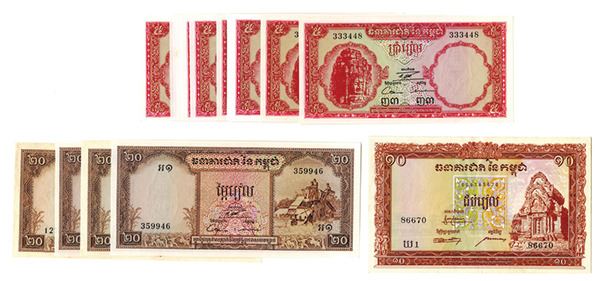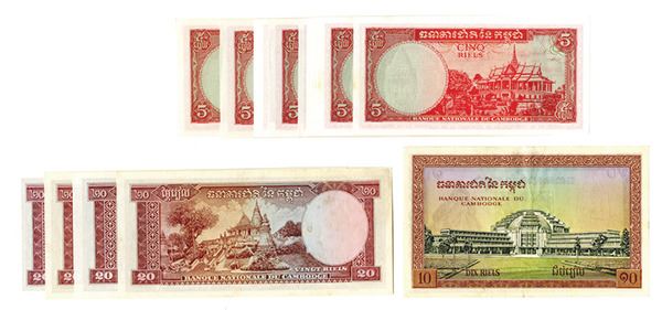 Cambodia, lot includes 10 Riels, ND (1955), P-3, Choice Very Fine; 5 Riels, ND (1970s), P-10c (15 pcs, all Uncirculated to Choice Uncirculated); and 20 Riels, ND (1970s), P-5d (4 pcs, 2 About Uncirculated, 2 Uncirculated).