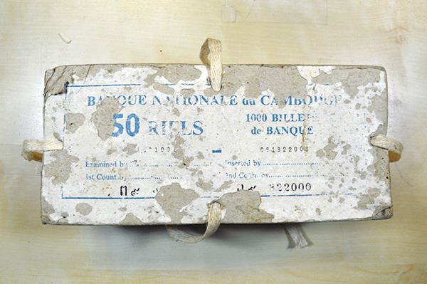 Cambodia. 50 Riels. P-7. Formerly sealed pack, ribbon ties now cut, notes begin with 321001 and end with 321521 with one out of sequence much higher, thus some 300+ notes missing from the original pack. Stains on ends affecting note margins. 500+ pieces.