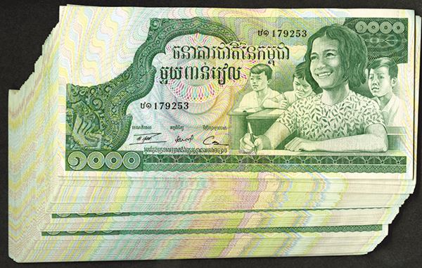Cambodia. 1000 Riels. P-17. Four school children at desks. Sculpture on back. Bold green design. All Uncirculated, many Choice. Over 80 pieces.