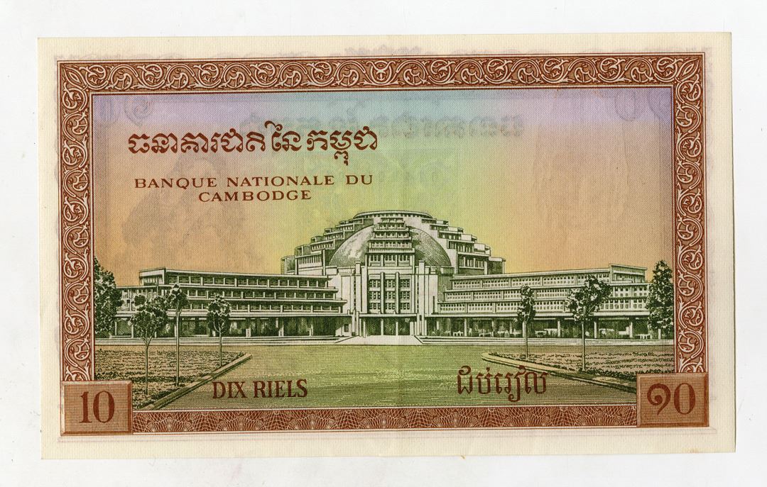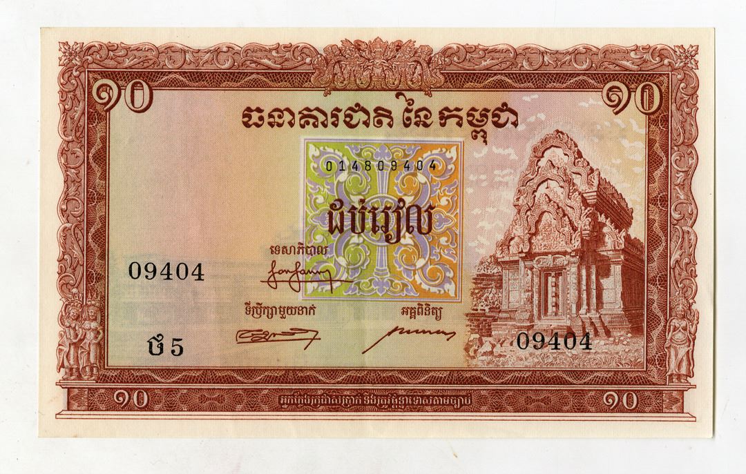 Cambodia….., ND (1955). 10 Riels, P-3a, Issued Banknote, Brown on m/c underprint with Temple of Banteal Srei at right, Back is brown and green central market at Phnom-Penh, Choice XF to AU condition, TDLR.