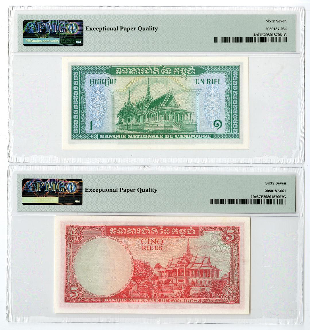 Cambodia. ND (1956-75). 2 Issued banknotes: 1 Riel, P-4c, Green and multicolor, S/N 2110 457102, Sign. #12, PMG graded Superb Gem Uncirculated 67 EPQ; 5 Riels, P-10c, Red and multicolor, S/N 113 067122, Watermark: Buddha, Sign. #12, PMG graded Superb Gem Uncirculated 67 EPQ. Both are printed by BWC. (2)