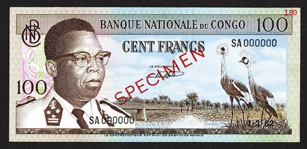 Congo. Banque Nationale du Congo. 100 Francs, 1.3.1962. SCWPM 6s. Specimen, typed 180 in top right corner. Choice Uncirculated.