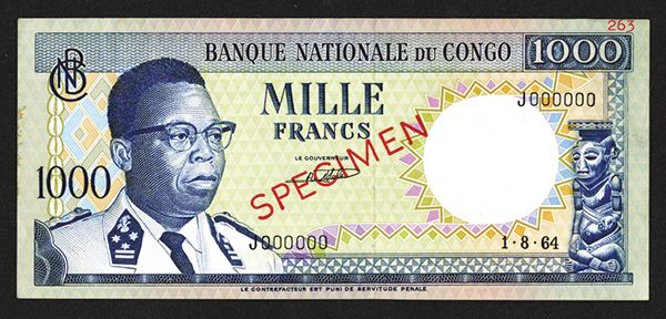 Congo. Banque Nationale du Congo. 1000 Francs, 1.8.1964. SCWPM 8s. Specimen, typed 263 in top right corner. Extremely Fine or better.