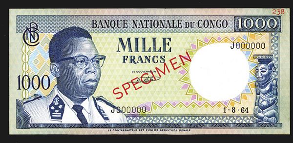Congo. 1000 Francs. SCWPM 8s. 1.8.1964. Kasavubu at left, large value on back. Overprint in red SPECIMEN on both sides, typed 238 in top right margin. About Uncirculated due to a slight corner bend.