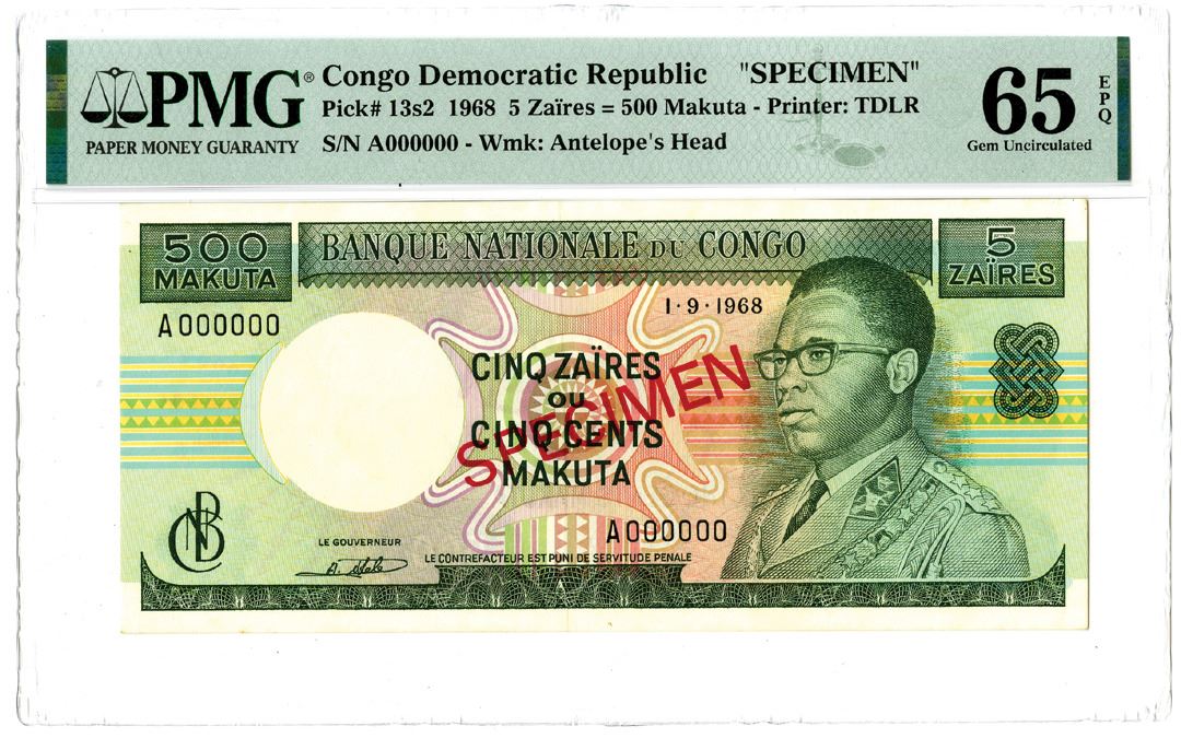 Congo Democratic Republic. 1968. 5 Zaire = 500 Makuta, P-13s2, Specimen Banknote. Green and m/c with Mobutu at right and Specimen overprint. S/N A000000 with watermark of antelope head. Printer: TDLR. PMG graded Gem Uncirculated 65 EPQ.