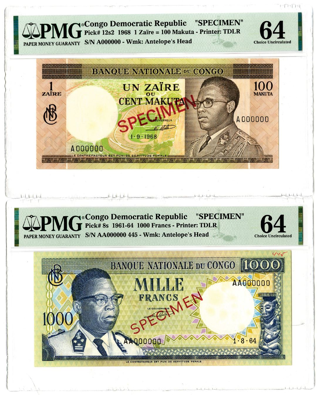 Congo Democratic Republic. 2 pieces: 1968, 1 Zaire = 100 Makuta, P-12s2, Specimen banknote, Brown and multicolor, S/N A000000; and 1961-64, 1000 Francs, P-8s, Specimen banknote, Blue and multicolor, S/N AA000000 445. Both have Antelope's Head Watermarks and are PMG graded Choice Uncirculated 64. TDLR. (2)