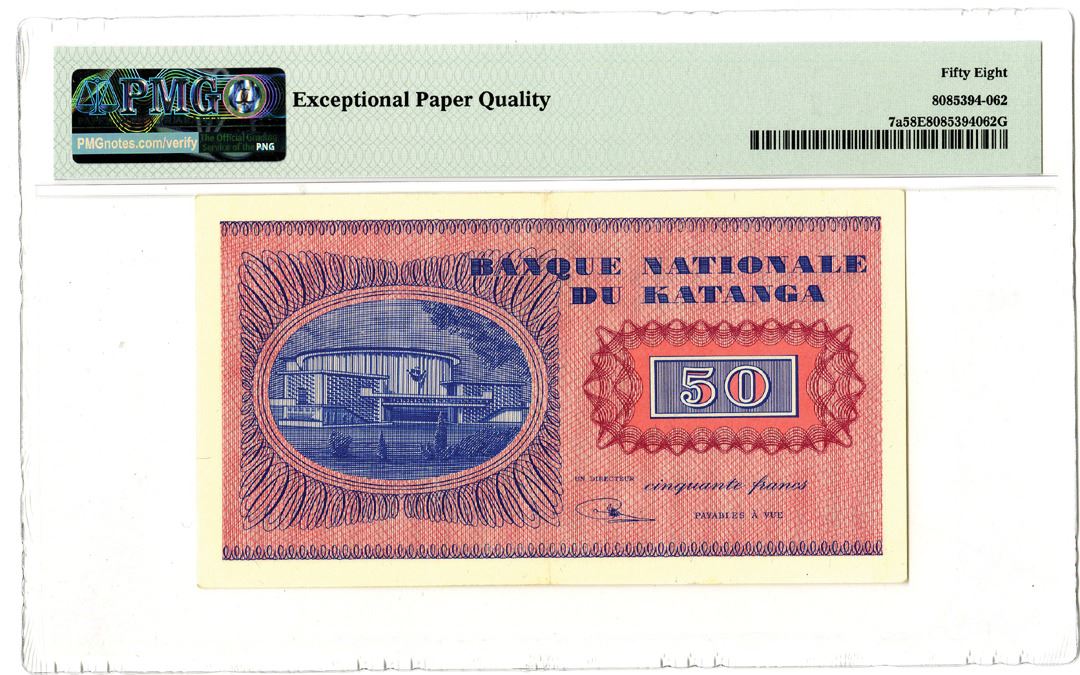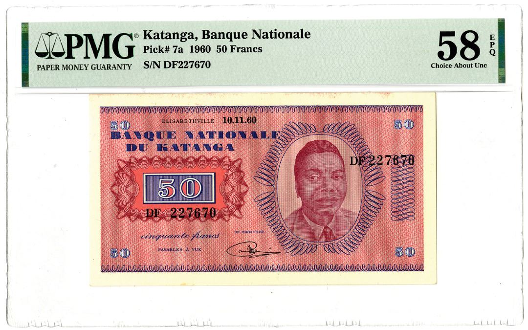 Katanga.... 1960. 50 Francs, P-7a, Issued banknote, Blue and multicolor, S/N DF227670, PMG graded Choice About Uncirculated 58 EPQ.