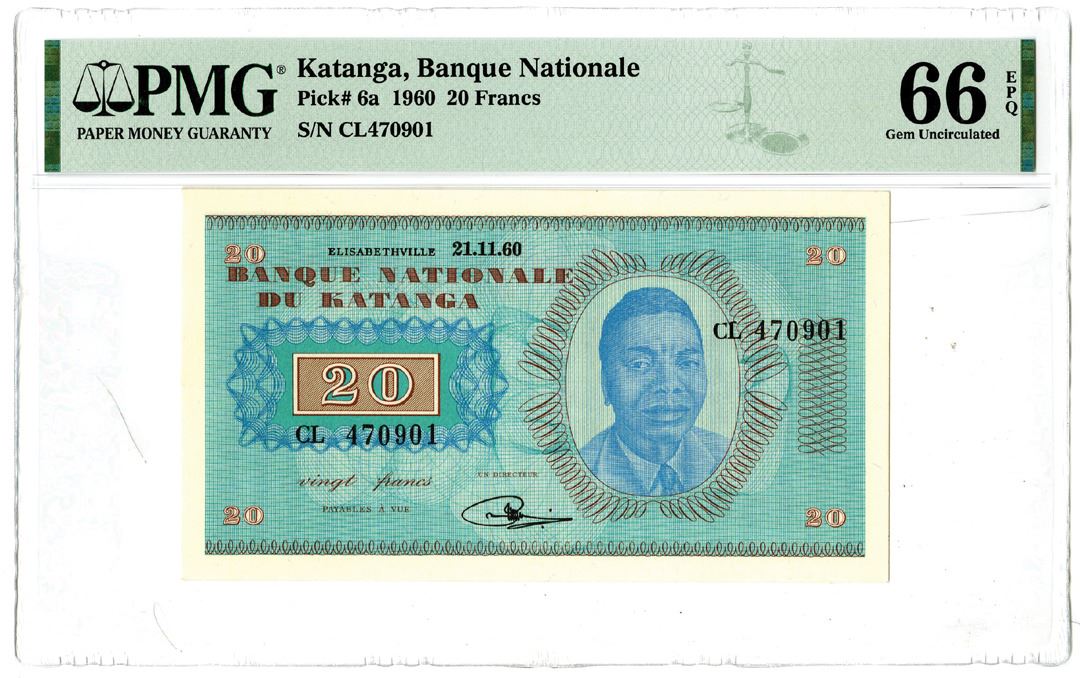 Katanga.... 1960. 20 Francs, P-6a, Issued banknote, Blue and teal, S/N CL470901, PMG graded Gem Uncirculated 66 EPQ. Only 5 Notes grade higher out of 54 graded in the PMG census.