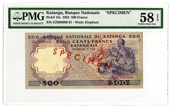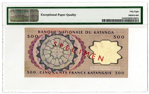 Katanga. Specimen 500 Francs, 1962, P-13s. PMG graded Choice About Unc 58 EPQ (Cert # 5003615-007).