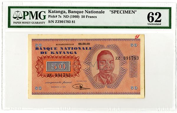 Katanga. Specimen 50 Francs, ND (1960), P-7s. PMG graded Uncirculated 62 (Cert # 5003615-018).