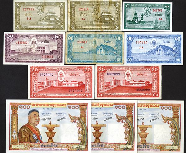 Laos. 1, 5, 10, 20, 50, 100 Kip. P-1a (Uncirculated) ; 2a, b; 3a (Uncirculated), b; 4; 5b (2, One Uncirculated; the other noted by the collector as Counterfeit, with staple holes); 6a (2 Choice Uncirculated, one with light paper tone at edge. The third is EF.) Grades as noted, otherwise Fine or so. (8)