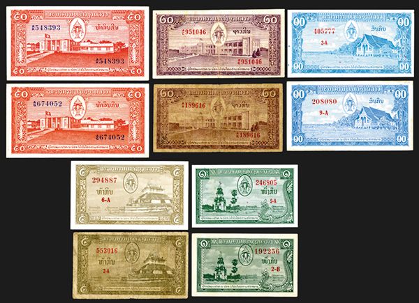 Laos. Pick# 1b, 2b, 3b, 4b, 5b. Second issue of each, without security dots. Mostly EF, two VG.