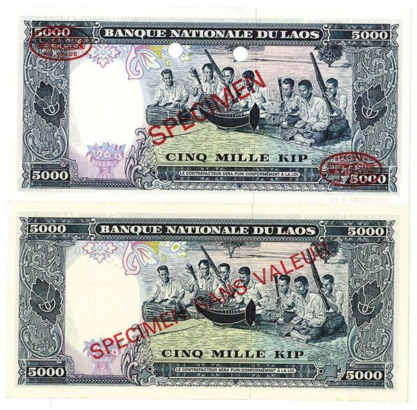 Laos..... Lot includes a pair of specimen 5000 Kip banknotes, both exactly the same s/n 000000 and signatures, but one has a "SPECIMEN" overprint together with TDLR ovals, a Specimen number, and POCs, while the other has a plain "SPECIMEN SANS VALEUR" overprint without any of the other features. P-19s (2). Choice Unc. (2)