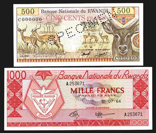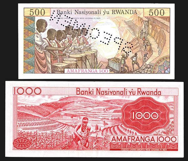 Rwanda. Pick 10a, Choice AU. First date of the type; Pick 13s. Specimen, Unc. Pin hole canceled. Bold design of Impalas on face, drummers and strip mine on back.