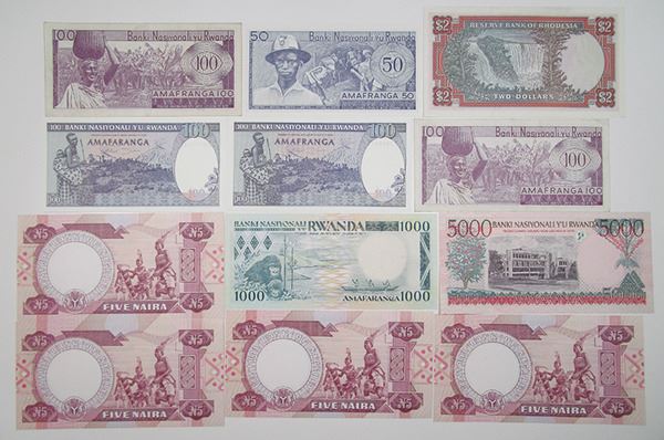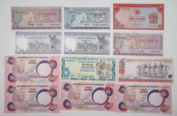 Rwanda, Rhodesia, Nigeria. Lot includes from Rwanda a set of 50, 100, 1000, and 5000 Francs; from Rhodesia a 2 Dollars dated 1979; from Nigeria a quartet of sequential 5 Naira notes, with partly faded s/n on one of them. Rwanda P-7, 8 (2); 18; 19; 21; 28; Rhodesia P-35d; Nigeria P-20 (4). About to Choice Unc. (12)