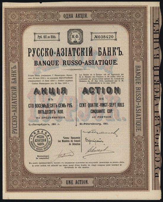 St. Petersburg, Russia, 1911, 187.50 Rubles, Black on brown border and underprint, Coupons attached, Bond in both Russian and French, VF-XF condition.