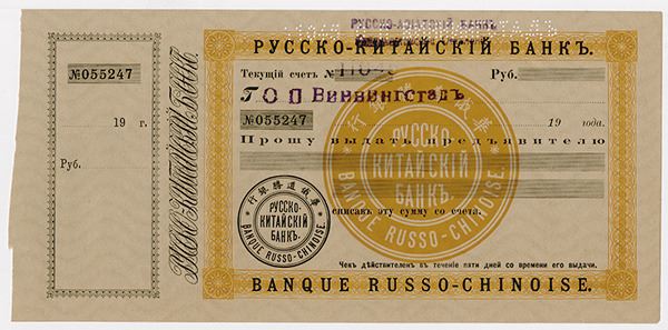 Russia & China. 19xx (ca.1900-1920). Odd Rubles. P-Unlisted. Unissued check or draft from this rare bank. Overprinted with "Russo-Asiatic Bank" purple handstamp. Includes counterfoil on left. Yellow and black. Chinese and Russian text in circle in middle. Wavy watermarked paper. S/N 055242, AU to Uncirculated condition. This was the base form for the extremely rare Emergency circulating currency from Harbin, China, Extremely rare fiscal item.