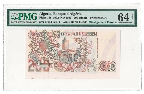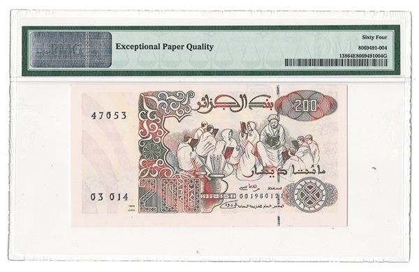Algeria. Lot includes 200 Dinars note with a misalignment error between the obverse and reverse. P-138. PMG graded Choice Unc 64 EPQ.